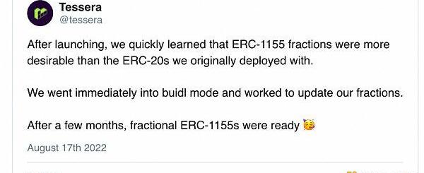 8月中旬,Tessera??在推特上表示,在启动后,我们很快了解到ERC-1155组分比我们最初部署的ERC-20s更加理想。