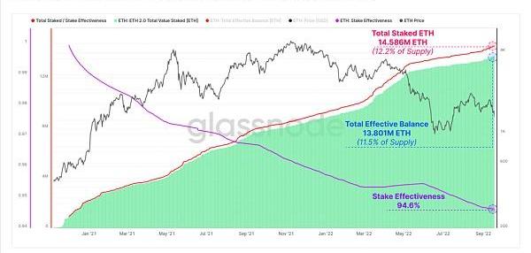 总共有42.96万活跃验证者,现在有超过1458.6万个ETH质押,占ETH总供应量的12.2%。由于以下原因,质押的ETH总量将随时间变化: