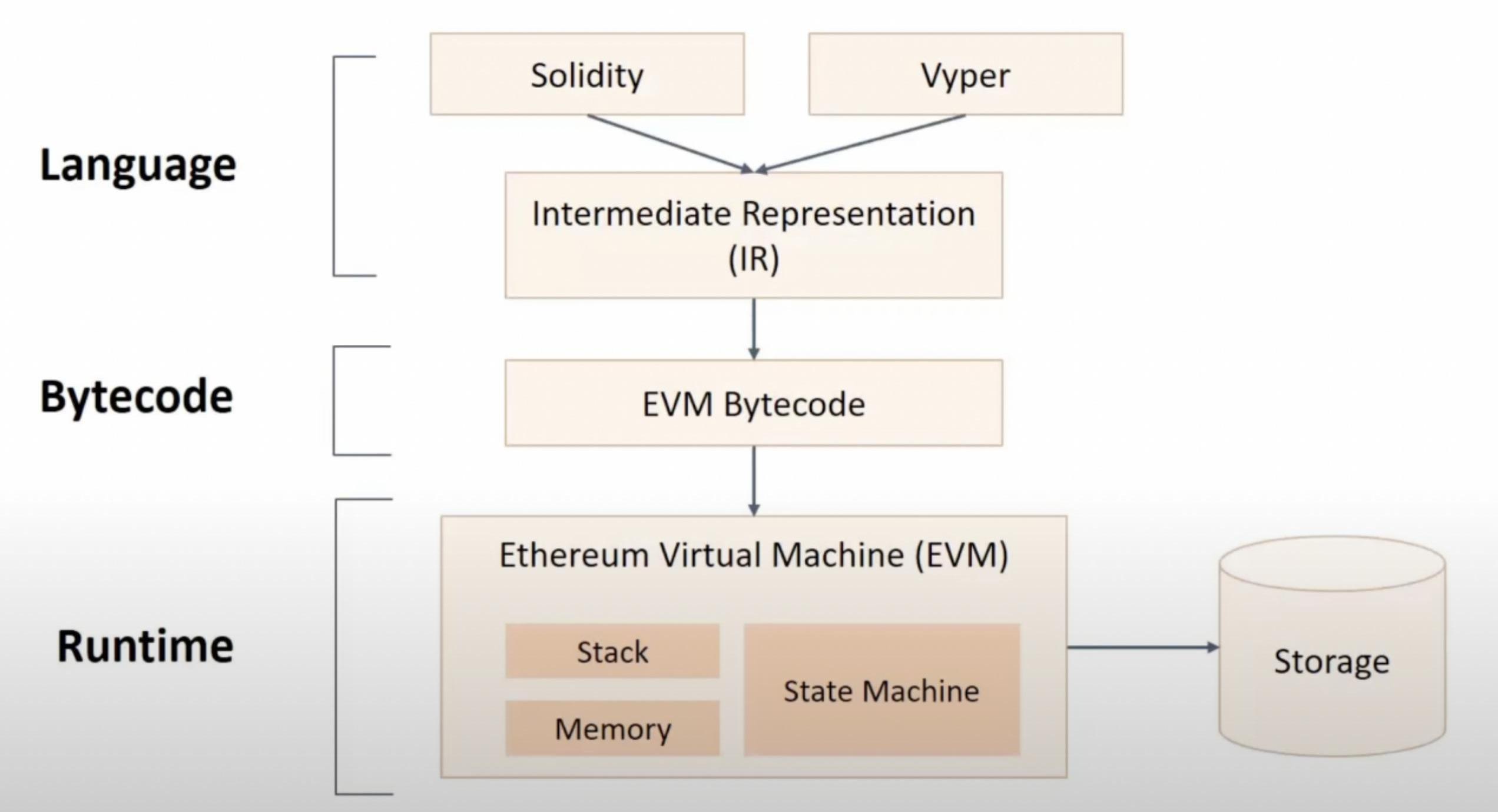 EVM指的是以太坊虚拟机,它相当于执行引擎,是以太坊智能合约的运行时环境。开发者通过高级编程语言如?Solidity编写业务逻辑,然后编译器把代码编译成低级编程语言字节码并执行相应指令修改系统状态。EVM是基于堆栈结构的虚拟机,在执行opcode的时候需要和stack、memory、storage交互。