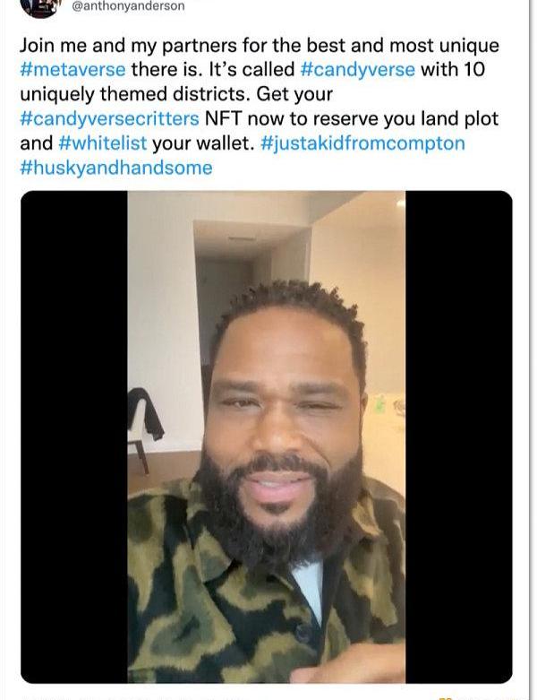 已经出现了名人站台涉NFT的现象。今年5月,美国喜剧演员安东尼·安德森推广过的NFT项目Candyverse停止更新,数百名投资者遭遇损失。