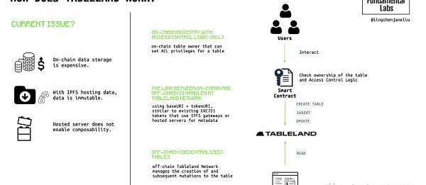 Tableland提供了一个技术解决方案来处理链上数据的局限性——不可更改性、存储成本昂贵、不可组合性和难以查询。Tableland建立了一个数据层,与纯EVM环境相比,数据层允许用户以更便宜的方式存储、读取和写入数据,拥有更多的存储空间。Tableland是如何做到这一点的,是通过两个组件:带有访问控制逻辑的链上注册表和链下表,Tableland中的每个表都是作为ERC721代币,在EVM兼容层上铸造。也就是说,拥有数据写入权力的访问控制逻辑存在于EVM中,用户通过存储在其以太坊钱包中的NFT拥有该权利。该协议有两个主要组成部分:链上注册表所有者和链下TablelandNetwork。链上和链下之间的链接都是在智能合约层处理的,它拥有不可变的质量。