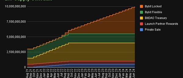 BitDAO的初始代币发布日期为2021年8月。该代币的最大供应量上限为10,000,000,000。BitDAO的供应预计将于2024年5月完全归属。