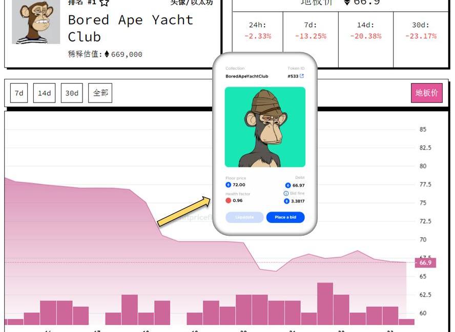 8月18日,BAYC的地板价下跌至72ETH左右,而此前曾在BendDAO上抵押借贷的BAYC#533的有利息债务为66.97ETH。