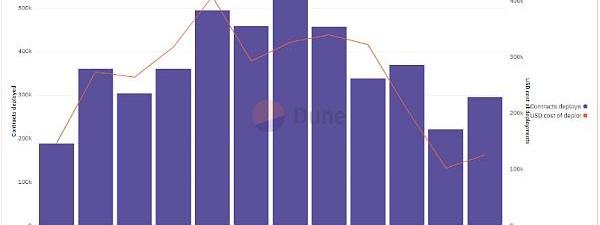 根据DuneAnalytics的数据统计,以太坊近期的网络建设活动尤为消沉,链上新增智能合约数量持续锐减,过去的6、7月份,以太坊单月合约部署数量都低于30万个。而在去年同期,这个数字高达270万个左右。