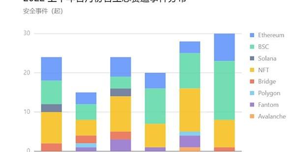 尽管2022年区块链技术正在飞速发展并且逐渐完善,但层出不穷的加密货币攻击事件对区块链生态安全态势提出了新的挑战。从统计数据来看,上半年发生安全事件次数较多的月份主要在5、6月;从各生态来看,BSC上安全事件发生最多;从赛道来看,损失最多的是跨链桥。