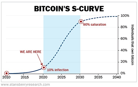 另有“性感”的S曲线加持,未来十年内,不断增长的渗透率会加速比特币价值的增涨。从当前的1万美金看涨至10万甚至百万美金,不再是个梦。