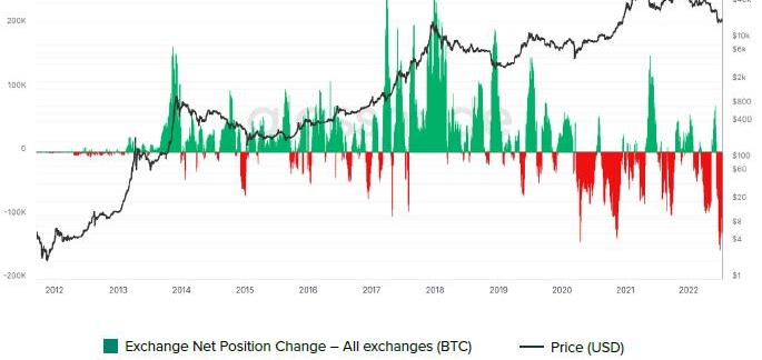 衡量比特币金额的30天交易所净头寸变化,在中心化交易所,2022年6月出现了有记录以来最大的资金流出,表明持有人正在将其代币从交易所和中心化借贷中转移出平台。这表明投资者可能对中心化管理的基金持谨慎态度于风险较高的策略,可能面临流动性问题的贷款人使用用户资金。相反,用户似乎在被动地选择持有他们的数字资产。