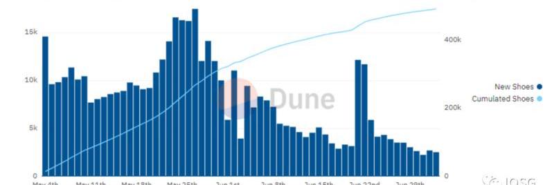 有了高度颗粒化的原始数据,分析师便可以在DuneAnalytics自由创建链上分析。如每日StepN新鞋铸造及历史积累数据https://dune.com/queries/627689/1170627