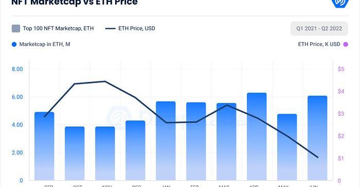 起初,NFT市场多项指标受到加密市场暴跌影响出现下挫,但随着投资者心态缓和,NFT很好地度过了这场风暴,与2021年第二季度相比,总交易量和销售额分别增长了533%和59%。尽管OpenSea是首屈一指的NFT交易平台,但随着LooksRare、x2y2和Solana的MagicEden等市场的出现,其份额有所下降。由于ETH的贬值,以太坊的前100个NFT集合的市值有所下降,自第一季度开始以来已经下降了63%。?
