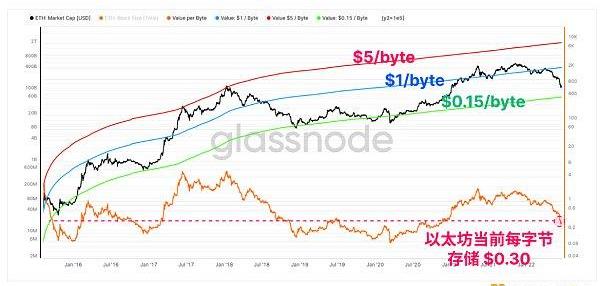 一个有趣的指标是由PermabullNino首次提出的,它描述了以太坊每一个区块链字节所捕获的价值。作为头部智能合约平台,并托管着一个充满活力的应用程序生态系统,由此可见,理论上每字节存储的数据捕获的价值应该随着网络效应的改善而增加。