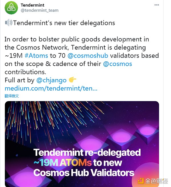 跨链项目Cosmos开发公司Tendermint发布官方公告称,将会把约1900万枚ATOM代币委托质押给70个验证节点,以奖励这些ATOM网络的积极贡献者。根据分发细则,Tendermint公司细分了5个委托等级,节点将会根据自己从年初至今为Cosmos做出的贡献度而获得10万、20万、30万、50万或70万枚ATOM。