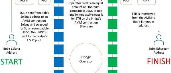 同样,用户首先将其资产SOL存入Solana的指定合约地址,该地址属于桥。然而,与之前的例子不同,这种存款实际上触发了SOL到Solana上的稳定币的AMM交换。例如,它可以将SOL换为USDC。从这里开始,这座桥的功能就像一座基于池的桥;桥提供者将Solana合约地址中的稳定币余额记入用户的以太坊合约地址上。最后,一旦USDC在以太坊上被记给了用户,桥接器就会执行另一次从USDC到ETH的AMM交换。然后这个ETH被记入用户指定的接收地址。从本质上讲,这些桥的功能是基于池的桥,只在链上转移稳定币,以便在跨链转移过程中提供更好的价格执行。与往常一样,这两条链上的AMM交换执行价格是交换桥相对于两个池中可用流动性的函数。