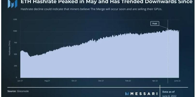 2022年5月,以太坊的哈希率达到顶峰。从那以后,其哈希率一直呈下降趋势,这表明矿工们预计合并将很快发生。哈希率的下降可能是由于矿工在测试网合并之后关闭了GPU矿机并转向交易市场出售。