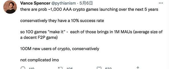 “未来5年内,市场上可能会出现大约1000款3A加密游戏,保守地说,这些游戏当中有10%会取得成功,也就是有100款游戏会成功,而每一款都会带来100万MAU,保守会有1亿新的加密用户,这一点也不复杂。”