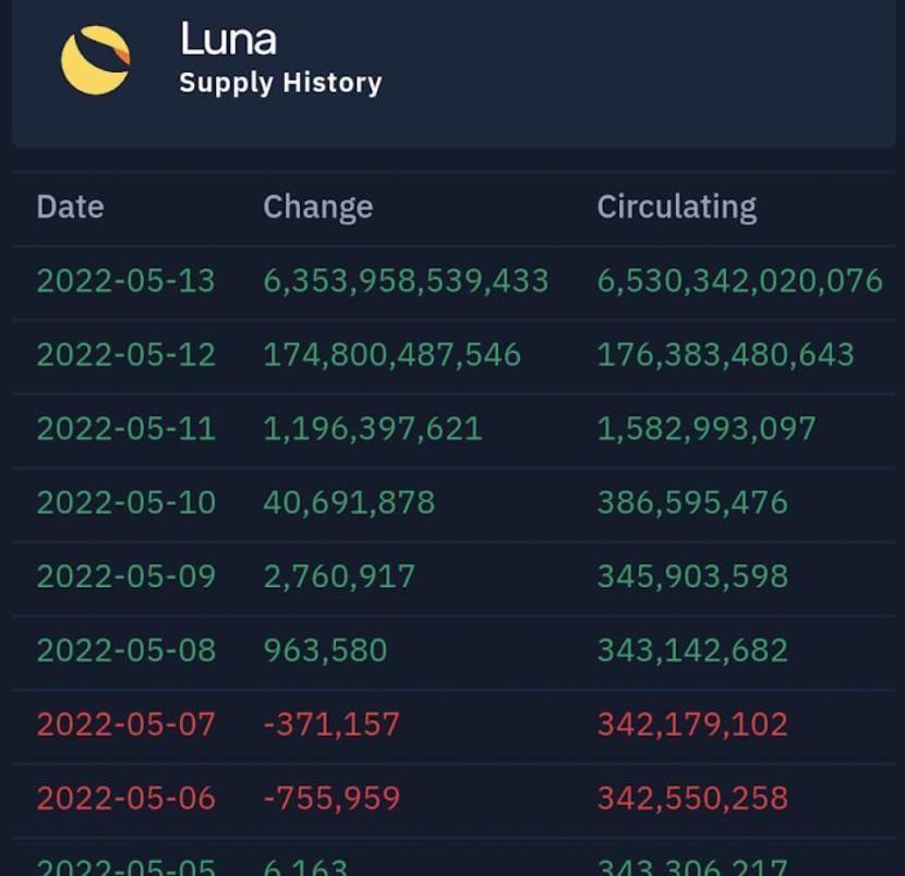 随着越来越多的UST被赎回为LUNA,为了满足所有的赎回,LUNA不得不以越来越快的速度印刷。最初,LUNA的铸币速度有一个每日上限,但为了清除积压,验证人投票决定放开这个上限,加快铸币速度。但市场没有能力吸收这种销售。Terra的算法印刷导致它进入了恶性通货膨胀的漩涡,就像一个第三世界国家顽固地印刷贬值的货币来偿还其债务人。