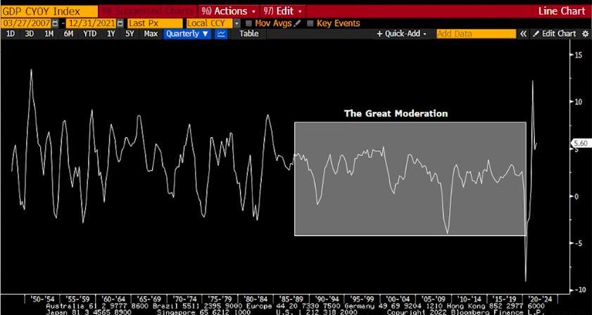 下图是美国GDP的图表,可以追溯到1947年。你可以看到在大稳健时期,GDP的增长更加低迷。GDP一直在持续下降,你可以看到的趋势率,自1970年代以来一直在下降。但我们也发现,GDP的波动性逐渐变小。至于2020以后,GDP又出现了较大波动,未来的走势我们可以拭目以待。