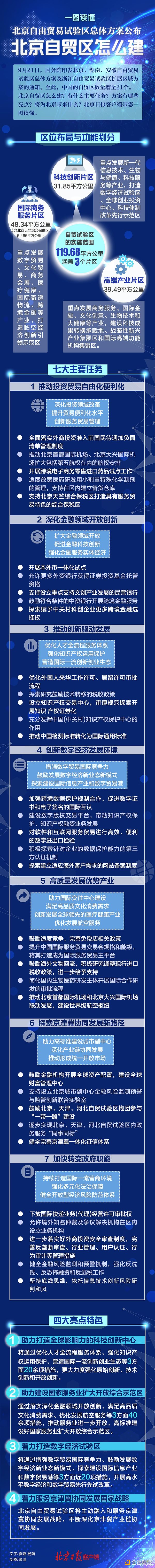 建立中国(北京)自由贸易试验区是党中央、国务院作出的重大决策,北京自贸区的实施范围119.68平方公里,涵盖3个片区,其中,科技创新片区31.85平方公里,国际商务服务片区48.34平方公里(含北京天竺综合保税区5.466平方公里),高端产业片区39.49平方公里。