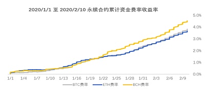 图1:OKEX BTC/ETH/BCH永续合约累计资金费率收益率 1/1 – 2/10