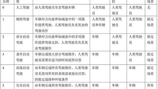 按照自动驾驶技术汽车达到自动驾驶的智能程度,国际汽车工程师协会将自动驾驶的级别划分为6个等级。
