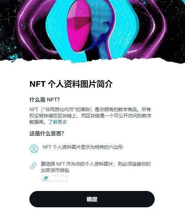 例如Twitter推出的订阅制会员服务TwitterBlue的其中一项功能就是「NFT头像认证」,开通了TwitterBlue后就可以把你重金购买的NFT应用在Twitter上,并且头像框是特有的六边形,证明你是这个「JPEG」的唯一主人。