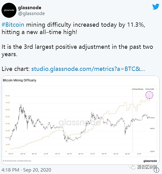 经过上周的大幅调整,比特币(BTC)的网络难度增加了11.35%。这使挖矿难度增加到了无法视而不见的19.314T。根据Glassnode分析师的估计,这一调整是过去几年中排名前三的向上调整。