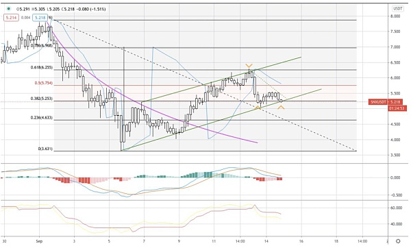 自7月下旬以来,SNX出现了三个方向的价格变动。首先是上涨,一些非常强大的支撑将SNX引向历史最高点。SNX随后出现了重大回调,从7.5美元一路跌至4美元,损失了近50%的价值。然后SNX到达目前的位置--在一个轻微的楔形/平行通道内交易。