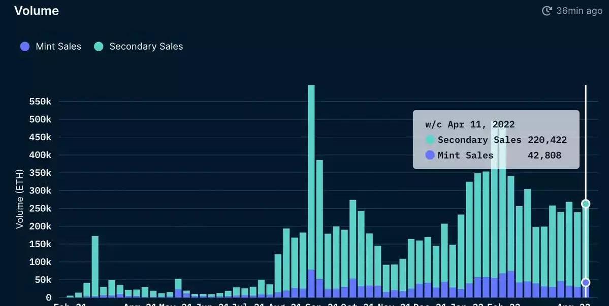 NFT大热,二级市场销售额平均每周在22万枚ETH上下。更有甚者,本周光是铸造销售额就达42,808ETH。246,232位用户在本周交易NFT,一共产生了636,125笔交易。