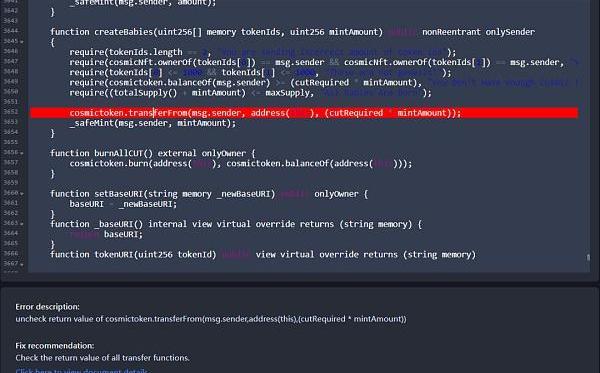 漏洞描述:未检测返回值。在NFT项目中,经常存在有偿铸币的功能,调用者需要将作为铸币手续费的ERC20代币发送到NFT铸币合约中,然后NFT铸币合约为其铸造对应数量的NFT代币。但是部分ERC20合约存在假充值的问题,即转账失败不抛出异常而是返回false,这样就会导致一个问题,攻击者可以利用这点,在未支付手续费的情况下,铸造任意数量的NFT。开发者应根据VaaS扫描结果的建议,检查transferFrom操作的返回值或者使用safeTransferFrom函数进行ERC20代币转账。