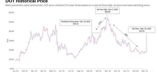 平行链的概念最早是在2016年的波卡白皮书中引入的。2021年10月,在SubstrateSub0会议上,联合创始人RobertHabermeier宣布中继链已准备好支持平行链。在接下来的三周里,Polkadot的原生代币DOT的价格在2021年11月5日上涨了57%至历史新高55.08美元,也就是社区批准第一个平行链插槽auction的第二天——2021年11月11日。然而,从2021年11月到2022年第一季度,Polkadot以及更广泛的加密市场的估值有所下降。截至2022年第一季度,DOT为22.5美元,比历史最高点下跌60%。