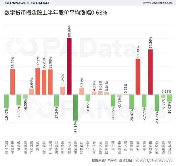 与同时期上证综指对比,数字货币概念股上半年相对上证综指涨幅的中位数是2.78%,略好于大盘表现。其中,14只概念股跑赢大盘,恒生电子跑赢同期上证综指83.14%,宇信科技和新开普也都跑赢大盘超50个百分点。另外13只概念股跑输大盘,尤其是金冠股份、御银股份、新国都、奥马电器,股价相对同期上证综指的跌幅都超过17%。