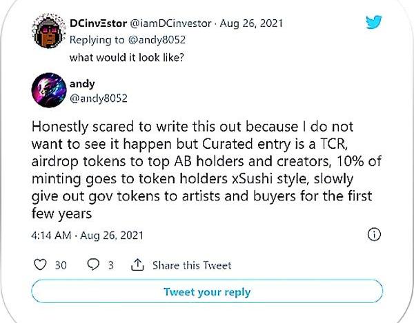 随着关于你的社区DAO很有趣的消息的扩撒,人们就会开始狂发私信给你要求加入你的DAO。此时,很多社区DAO就会发行ERC-20代币作为加入会员的门槛。根据社区DAO的排外性,会员资格费从价值几美元到几百万美元的ETH不等。