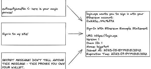 连接钱包后的第一步是给用户提供人类可读的消息,这样他们才能理解自己进行了什么交互。在很多案例中,用户看到的是"LOGIN"(登录)字样,或者一些让你登录的文字,甚至有时只是一个任意的数字(在这里,对这个随机的疯狂的字母和数字集合签名吧)。那么相反,我们可以根据现有实践确定一组必需的字段、设定好许多良好的安全措施和一个在人类可读和安全运行之间平衡的严格语法。此外,钱包不需要改变它们现有界面和实践,至少可以继续为用户提供这类信息。