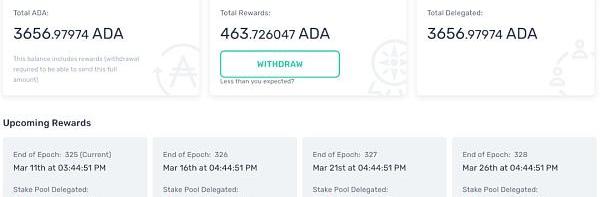 例如,在Cardano上质押ADA涉及加入一个质押池,该质押池始终参与区块验证,并且没有完全被质押者饱和。将资金投入质押池后,用户每期都会获得ADA通证奖励,估计返还其存款的4.5%-6%APY。