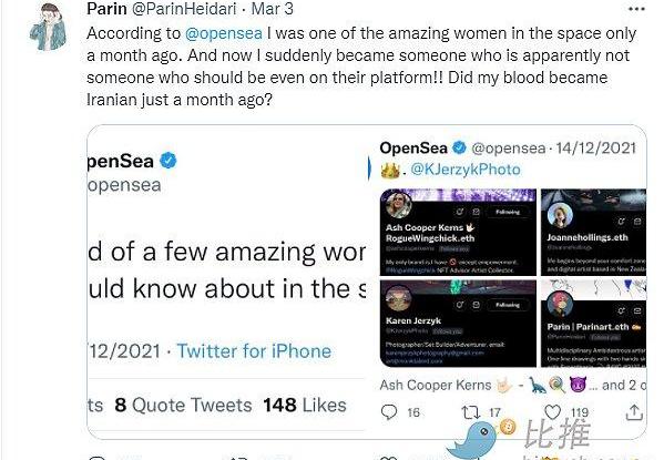 2022年3月3日,艺术家@ParinHeidari在其推特上表示,她已经无法使用OpenSea的服务,除此之外其全部藏品也均被从OpenSea下架,而其中一个验证系列藏品总交易量高达?218ETH。