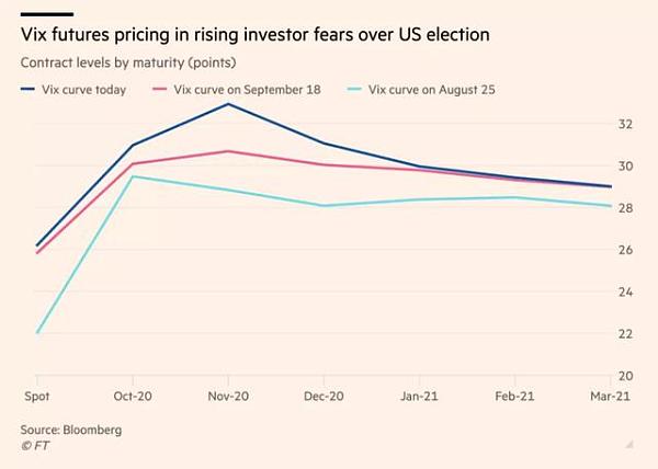 对有争议的选举的担忧推高了VIX期货(通过波动率衡量市场不确定性的晴雨表)。经济学家,策略师和分析师预测,在美国大选之前,VIX指数将进一步上升,这可能导致短期股市下跌。