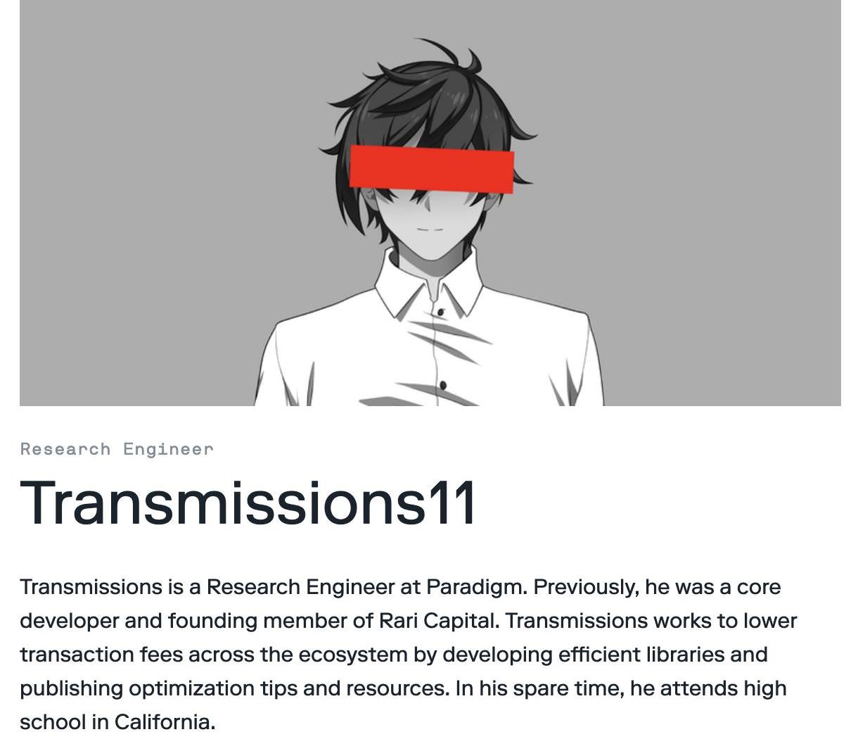 2月中旬,知名加密风投机构Paradigm公布,匿名开发者Transmissions加入Paradigm担任研究工程师。Transmissions作为匿名开发者,网络上关于其个人的信息并不多,但Paradigm公开的信息表示,此人将利用业余时间在加州完成高中学业。