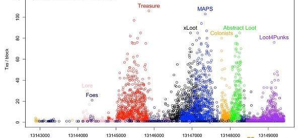 在需求高峰期,就会出现“Gas战争”。这在高需求NFTDrop期间给用户带来了很糟糕的体验。比如,在Loot项目取得突破性成功后,急于mint和上市Loot衍生品导致gas费多次飙升,从而提高了整个以太坊网络的交易价格。下图显示了去年9月2日,每当铸造Loot品衍生品时,gas费是如何大幅上涨的。