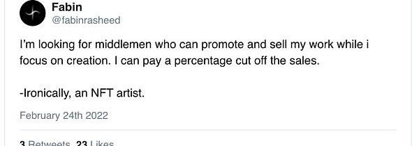 艺术家喜欢艺术创作,但当涉及到商业和宣传事务时,许多人感到迷茫,这是完全可以理解的。在过去的两年里,我看到越来越多的加密艺术家探索将这项工作委托给有商业才干的专家,就像音乐推广人如何为音乐家推广一样。我认为,随着加密艺术家变得更加流行,这一情景进一步饱和,我们将看到更多的加密艺术推广人提供他们的服务。