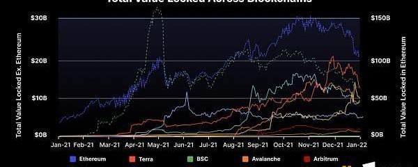 上图:在TVL(总锁仓价值)方面,以太坊区块链依然占主导地位,但其他区块链网络的TVL正在增长。数据来源:DeFiLlama