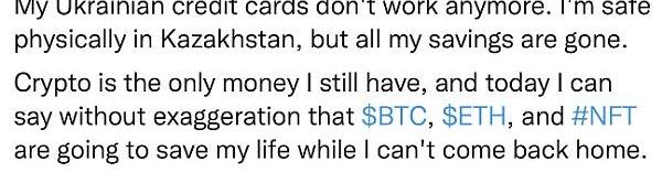 对于乌克兰民众而言,传统的金融体系在战乱中已无法正常运转,个人财产随着信用卡的失效而无法提供基本的生存保障——@usleepwalker在推特上分享了自己的遭遇。我们看到“cryptoistheonlymoneyIstillhave”这句话时,是否会感慨良多?