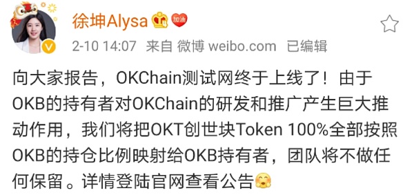 徐坤所说的OKChain测试网已于2020年2月10日正式上线,团队发行OKT作为OKChain的基础通证,OKChain团队将把创世块TOKEN 100%全部按照OKB的持仓比例映射给OKB持有者,团队将不做任何保留。