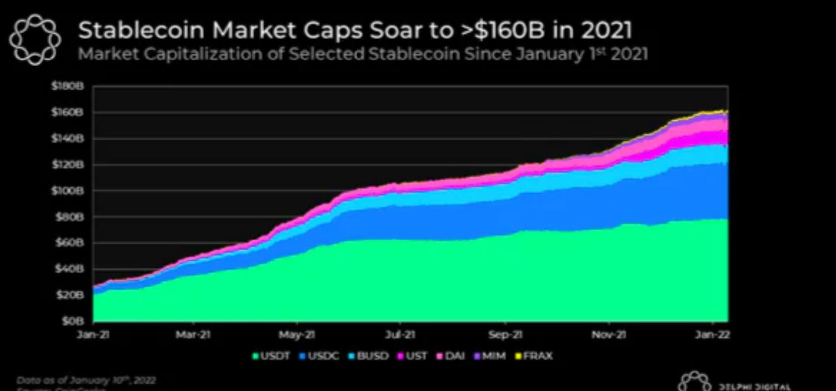 Stablecoin在2021年爆炸性增长,总市值超过1500亿美元。这种激增证明了Stablecoin作为加密货币的「杀手级应用」,产品和市场高度契合,像USDC和USDT这样的资产在整个加密货币生态系统中无处不在,这一趋势也将继续下去。