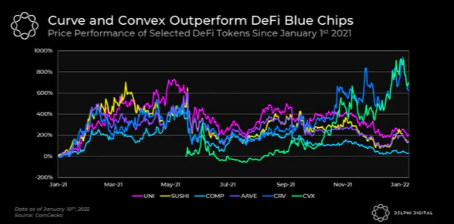 DelphiDigital还预测去中心化Stablecoin的造币王者Curve(CRV)和Convex的共生关系将使其成为TVL的第一大应用,达到230亿美元,在业绩方面超过其他DeFi蓝筹。