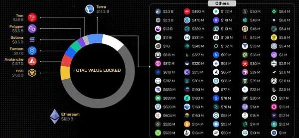 就DeFi领域而言,Terra、BinanceSmartChain(BSC)、Avalanche、Fantom或Solana等替代性L1区块链网络已经成功地在DeFi生态系统中获得了可观的市场份额。Coin98Analytics的数据显示,目前这些替代性L1区块链中的DeFi协议的TVL(总锁仓价值)合计占到了整个DeFi领域中的所有资本的三分之一以上。如下图所示: