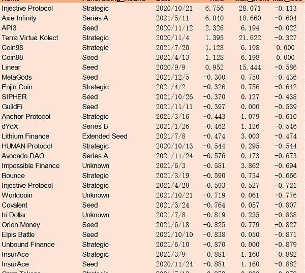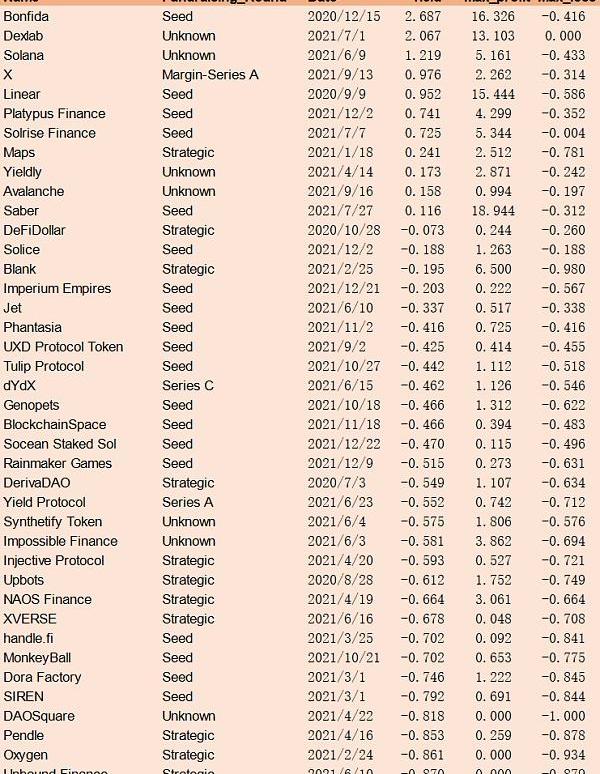 非常重要的一点是,项目token的损益不是从发行日开始算起,而是从融资信息公布日开始算。以AxieInfinity为例,该项目发行至今上涨了超过300倍,a16z与Paradigm等一众知名VC都参与了其B轮融资,但如果按发行以来的收益率计算就会高估他们的实际收益率。事实上,B轮融资是去年10月公布的,而Axie的暴涨发生在去年夏天,如果只计算10月以来收益率,那么真实数字为-50%。