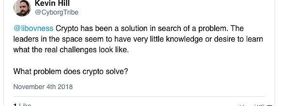 加密货币一直是一个寻找问题的解决方案。该领域的领导者似乎很少了解,或渴望了解真正的挑战是什么样子的。
