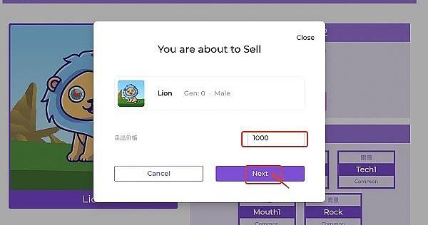 七、卖出价格填写完成,点击“Next”进行下一步,最后在你的钱包上点击“确认”,确认之后你的小狮子就挂单完成,它将在“淘狮子”里等待被购买!