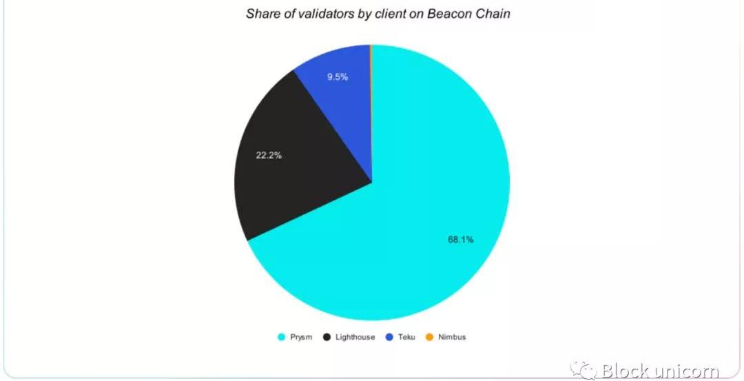 以太坊有许多客户端实现,每个客户端在参与ProofofStake的验证者总数中都有不同的份额。今天,客户多样性远非最佳: