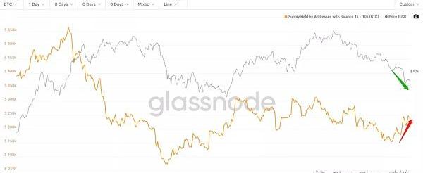 价格下跌,1K-10K鲸鱼持仓在增加,说明主力在缓慢的吸筹中。