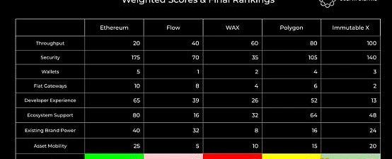 如上所示,ImmutableX综合得分排名第二,仅在以太坊之后,主要是因为吞吐量高以及安全性好。它在所有最重要和最难改善的因素中都表现出色。Polygon紧随其后。虽然Polygon在任何一个因素中都没有得到最好的分数,但它也没有在任何因素中得到最差的分数。在所有重要的方面,Polygon是一个平衡的解决方案,在这些方面没有任何重大缺陷。接下来是Flow,其NBATopShot如此成功的两个关键因素——其品牌力量和法币业务。最后是WAX,除了拥有一定的吞吐量外,它在其他方面都是落后的。
